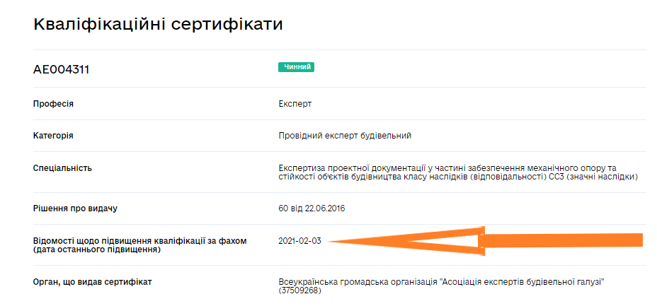 Подивитись дату останнього підвищення кваліфікації конкретним виконавцем Ви можете на Порталі державної електронної системи у сфері будівництва –Реєстри-Атестовані особи-Експерти