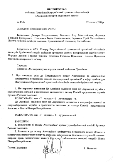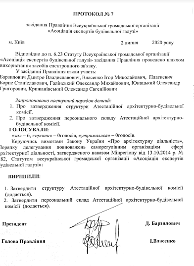 - ПРОТОКОЛ № 7 засідання Правління Всеукраїнської громадської організації «Асоціація експертів будівельної галузі»