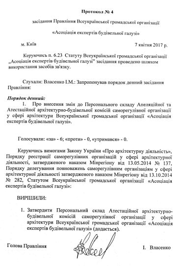 - ПРОТОКОЛ № 4 засідання Правління Всеукраїнської громадської організації «Асоціація експертів будівельної галузі»