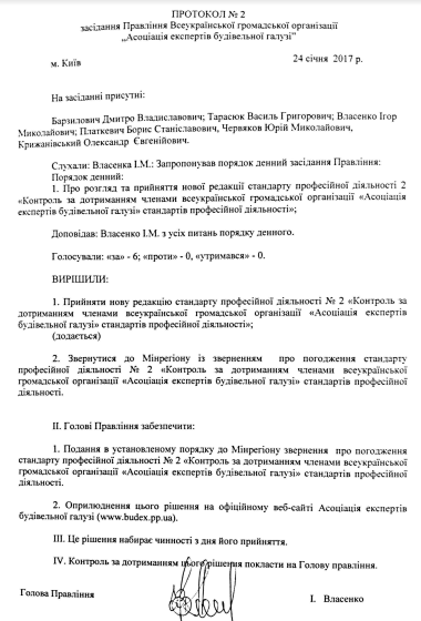 - ПРОТОКОЛ № 6 засідання Правління Всеукраїнської громадської організації «Асоціація експертів будівельної галузі»